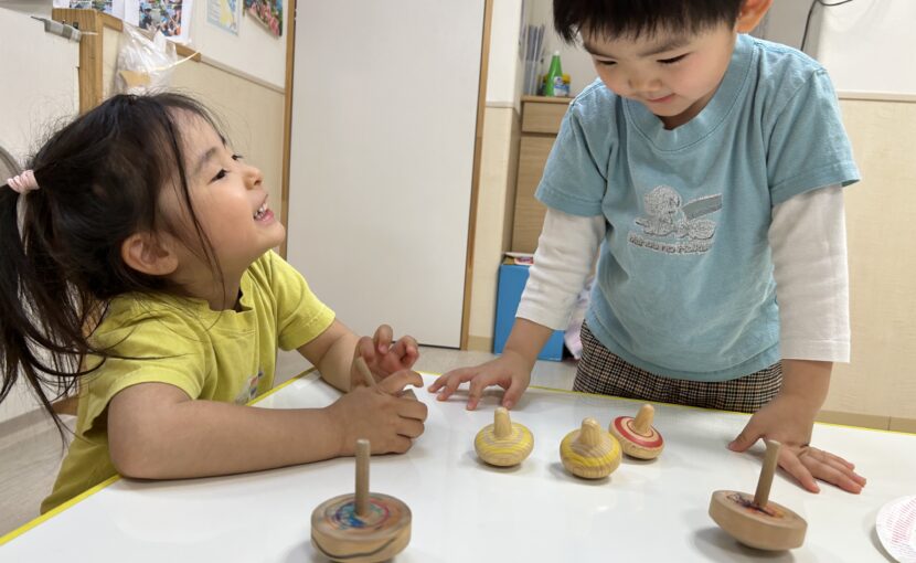 “こま回し”に挑戦! 「どうしたら長く回るかな?」と研究中です♪